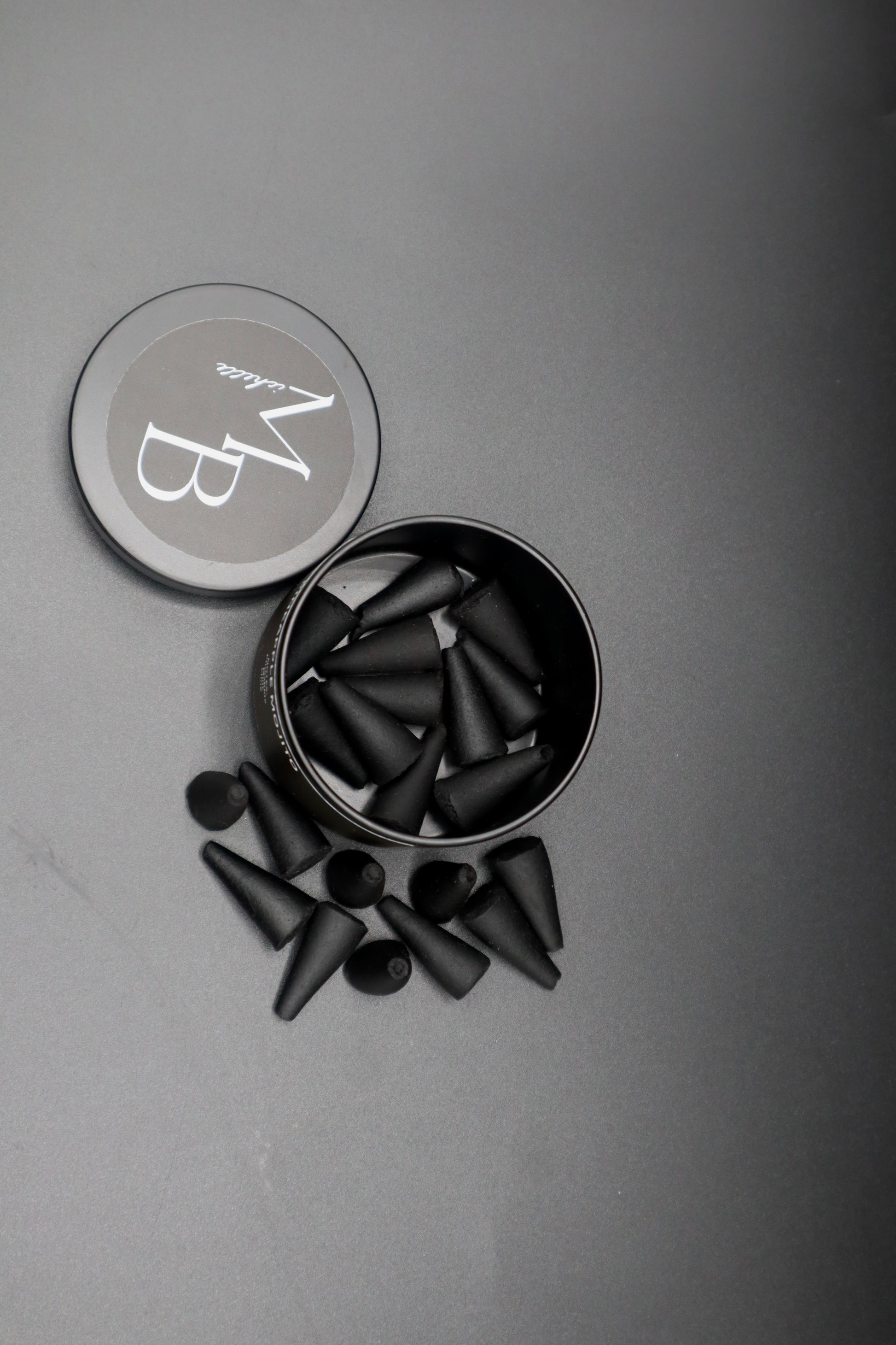 Approximately 20 charcoal incense cones are included in a matte black tin.